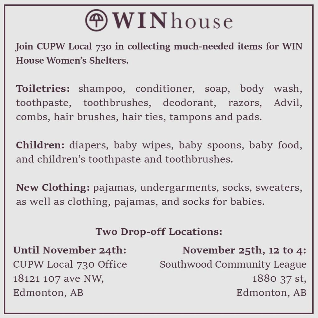 Join the Edmonton Local 730 Human Rights and Indigenous Rights committees in helping to collect much needed items for WIN House Women’s Shelters.